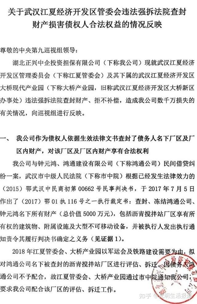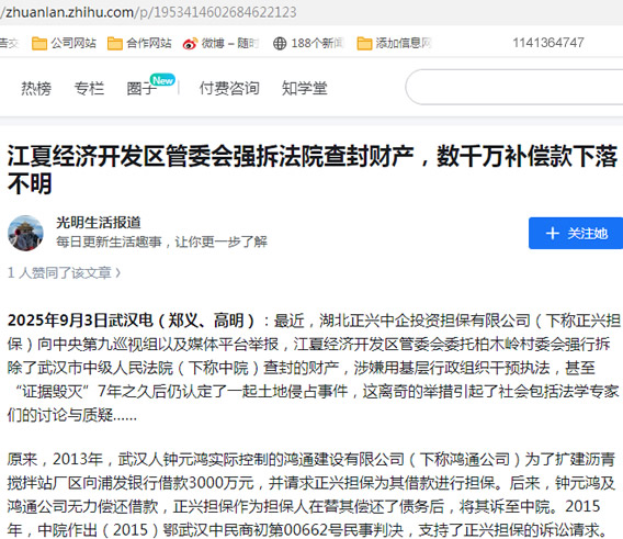 2025年9月3日武汉电(郑义、高明):最近,湖北正兴中企投资担保有限公司(下称正兴担保)向中央第九巡视组以及媒体平台举报,江夏经济开发区某部门委托柏木岭村委会强行拆除了武汉市中级人民法院(下称中院)查封的财产,涉嫌用基层行政组织干预执法,甚至“证据毁灭”7年之久后仍认定了一起土地侵占事件,这离奇的举措引起了社会包括法学专家们的讨论与质疑……