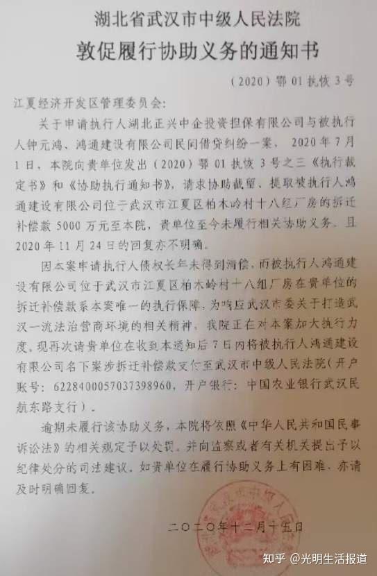 因该《回复》的理由并不充分亦无相关佐证,中院随即于2020年12月15日又向江夏经济开发区某部门送达了《敦促履行协助义务的通知书》,再次责令该某部门履行义务,并告知若逾期未履行该协助义务,将向监察或有关机关提出予以纪律处分的司法建议。2021年2月3日,江夏经济开发区某部门为了规避法院的处罚,再次向中院作出了回复,声称鸿通公司无任何相关补偿。