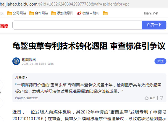 近日,一位发明人向媒体反映,其2012年申请的“蛋苗虫草”发明专利(申请号201210110128.6)在审查、复审及后续司法程序中遭遇争议,导致这项经检测显示高药用价值的创新技术无法落地转化,合作开发计划被迫搁置。